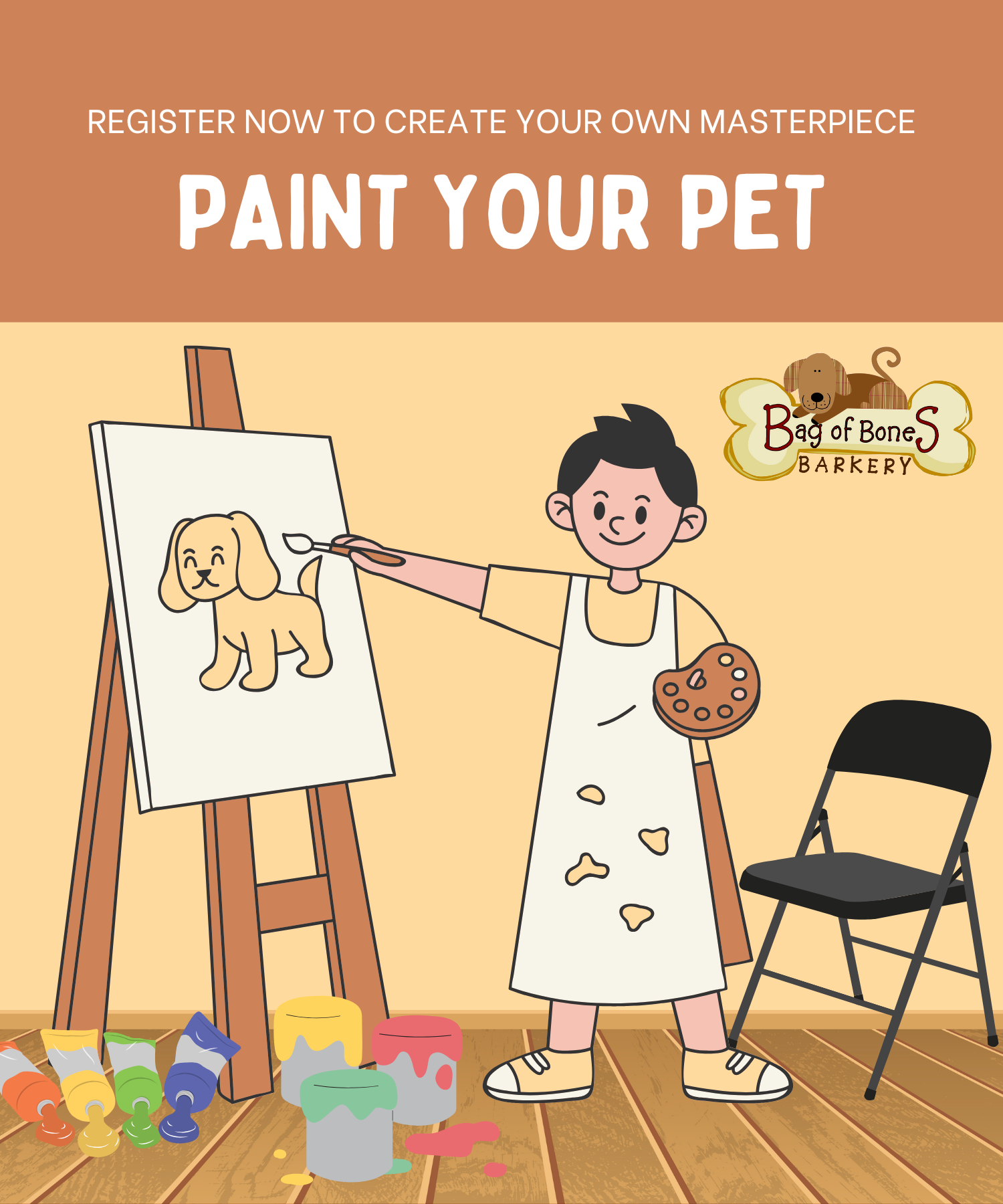 Each class runs approximately 3 hours, and you will need every minute of those three hours to complete your masterpiece. At Bag of Bones Barkery events, each canvas is 16x20in unless otherwise noted.
